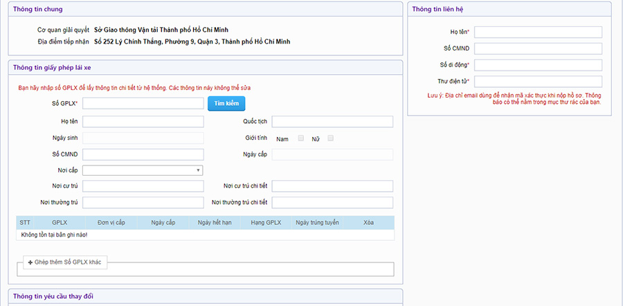 Chọn đúng Sở GTVT tại địa phương và địa điểm tiếp nhận, lưu ý là ở Sài Gòn thì chỉ còn ở 252 Lý Chính Thắng chứ không còn nhiều địa điểm như hồi trước. Click nút đăng ký sẽ chuyển tới trang điền thông tin: