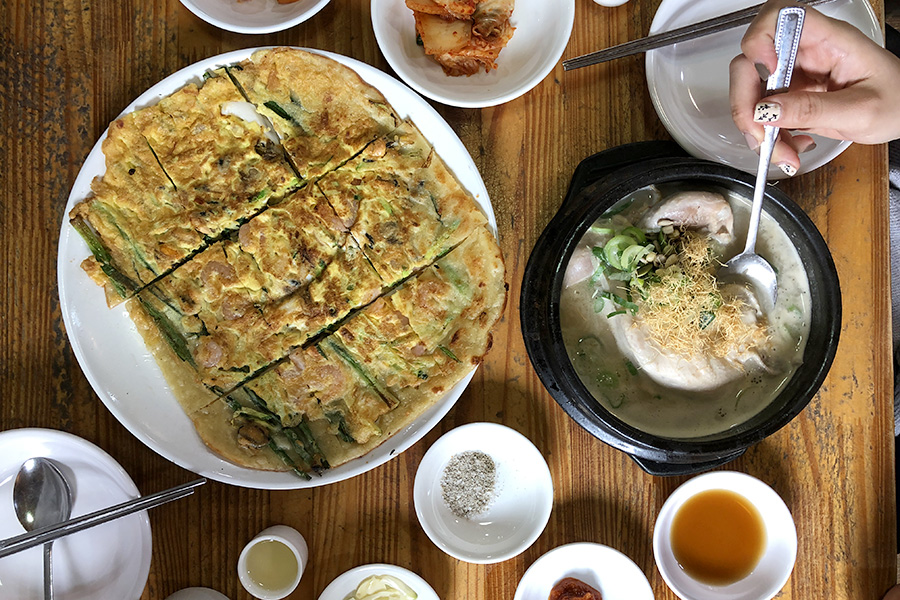 Trưa tới nơi, chúng tôi ăn món cơm trộn truyền thống rồi nhận phòng tại một nhà nghỉ cổ kính trong làng cổ Jeonju Hanok. Căn phòng nhỏ, giường trải nệm, sàn gỗ, mọi thứ đều mang vẻ hoài cổ. Chiều đến, chúng tôi đi bộ khám phá khu làng, ghé đền Gyeonggijeon, leo đồi lên Omokdae - Imokdae, nơi có thể nhìn thấy toàn cảnh làng cổ. Dưới ánh chiều tà, mái ngói cong cong, những con đường lát đá, sương xuống mờ ảo… tất cả như một bức tranh xưa cũ.