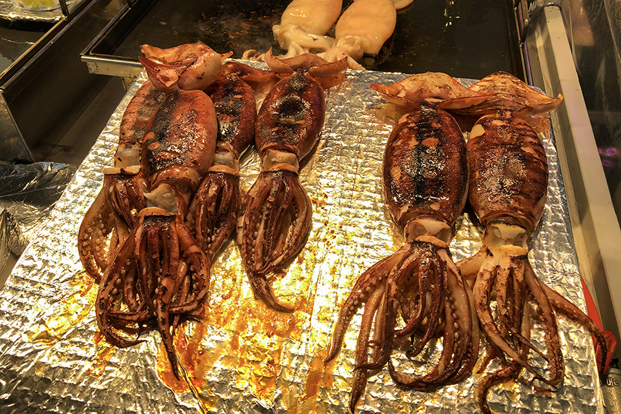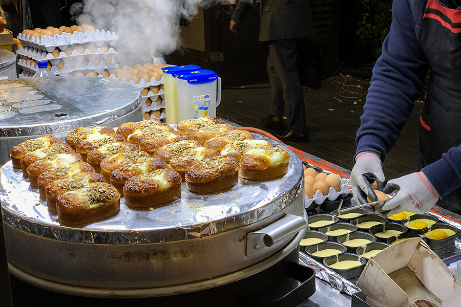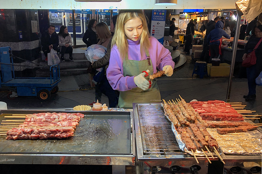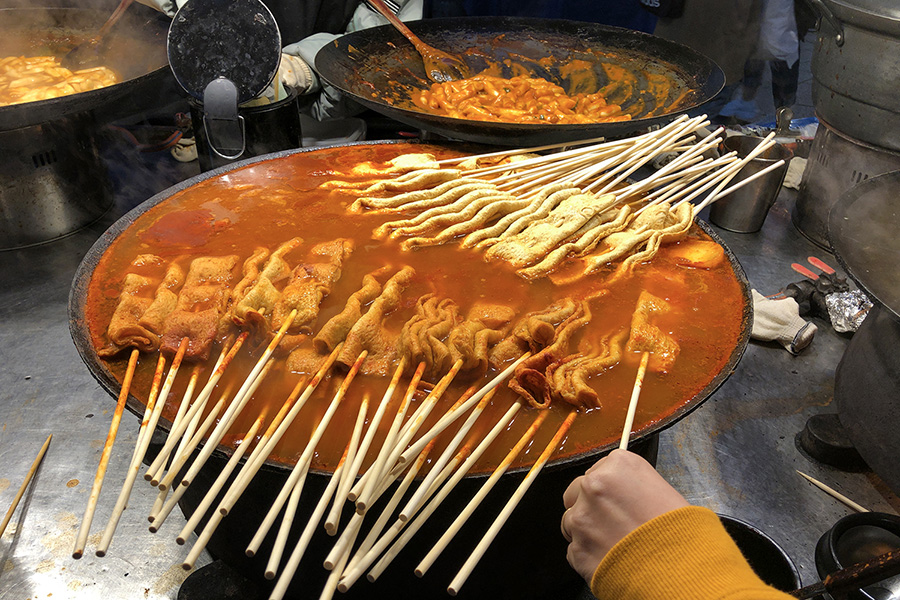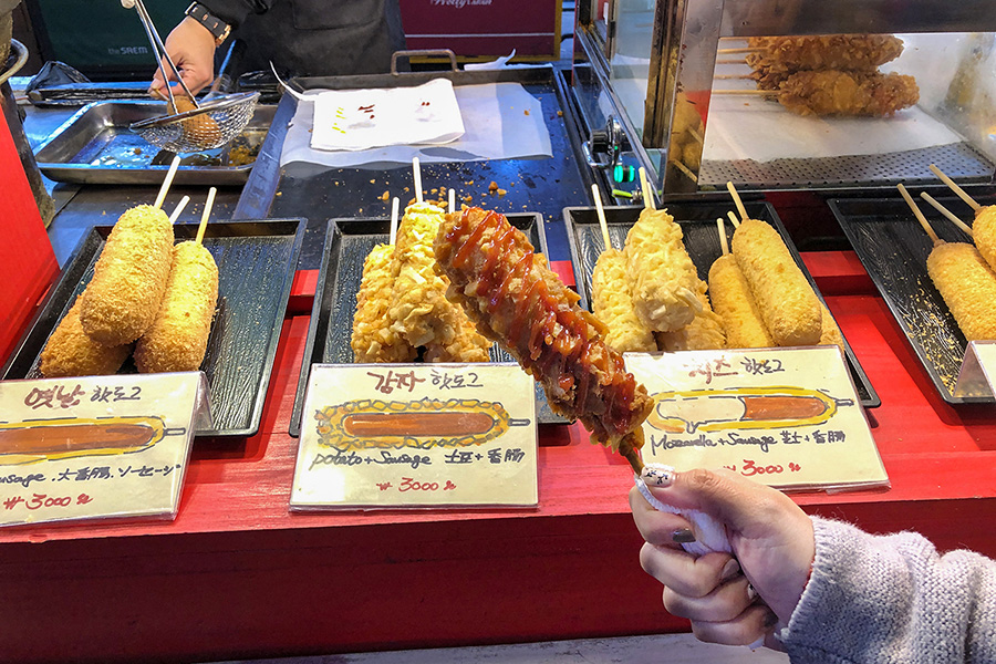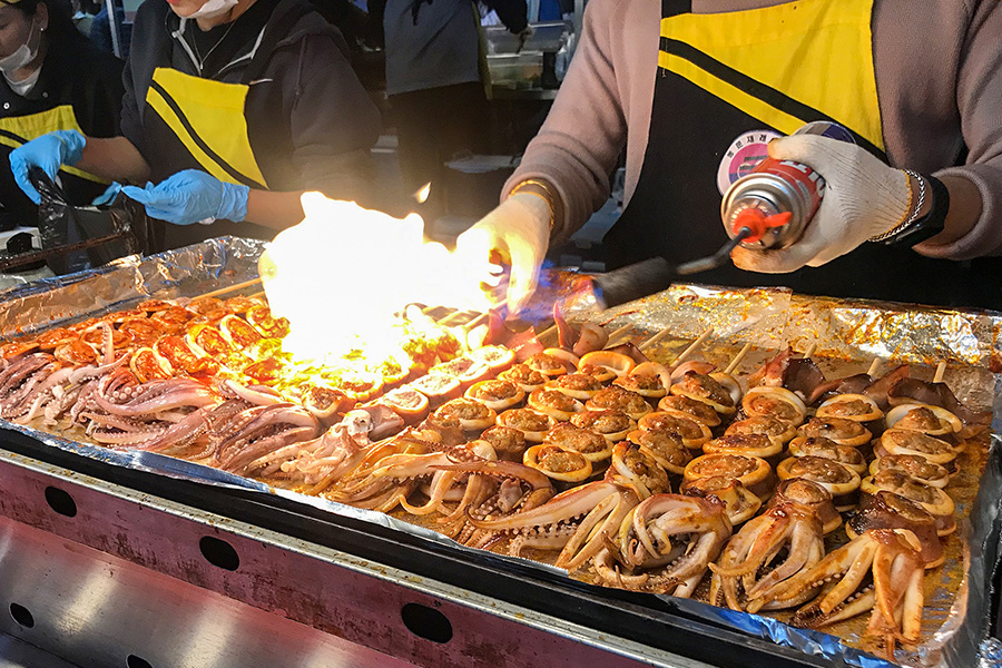Tối đó, chúng tôi lạc vào chợ đêm Dongmun, vừa ăn vừa khám phá: xiên thịt, bánh cá, hải sản chiên, khoai lang nướng... Mỗi món ăn như một lát cắt của văn hóa địa phương, đơn giản nhưng gợi nhớ.