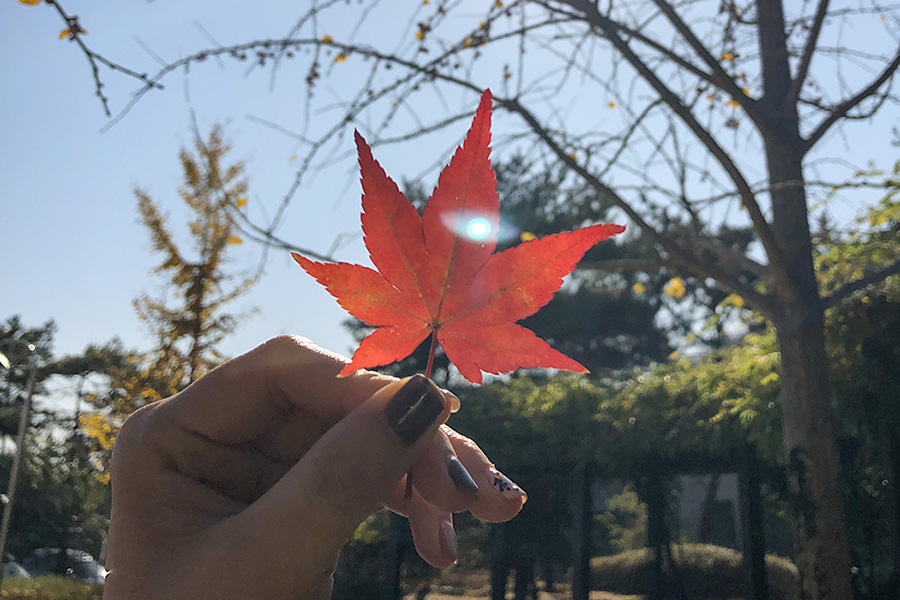 Sáng sớm, chúng tôi bắt xe bus đến vườn quốc gia Naejangsan. Xe đông, phải đứng suốt chặng đường dài nhưng không ai than phiền. Khi đặt chân xuống bến, một biển rừng đỏ rực hiện ra trước mắt. Hàng cây thẳng tắp, lá vàng đỏ trải đầy lối đi, không khí trong lành và gió se se - như lạc vào một thế giới khác.